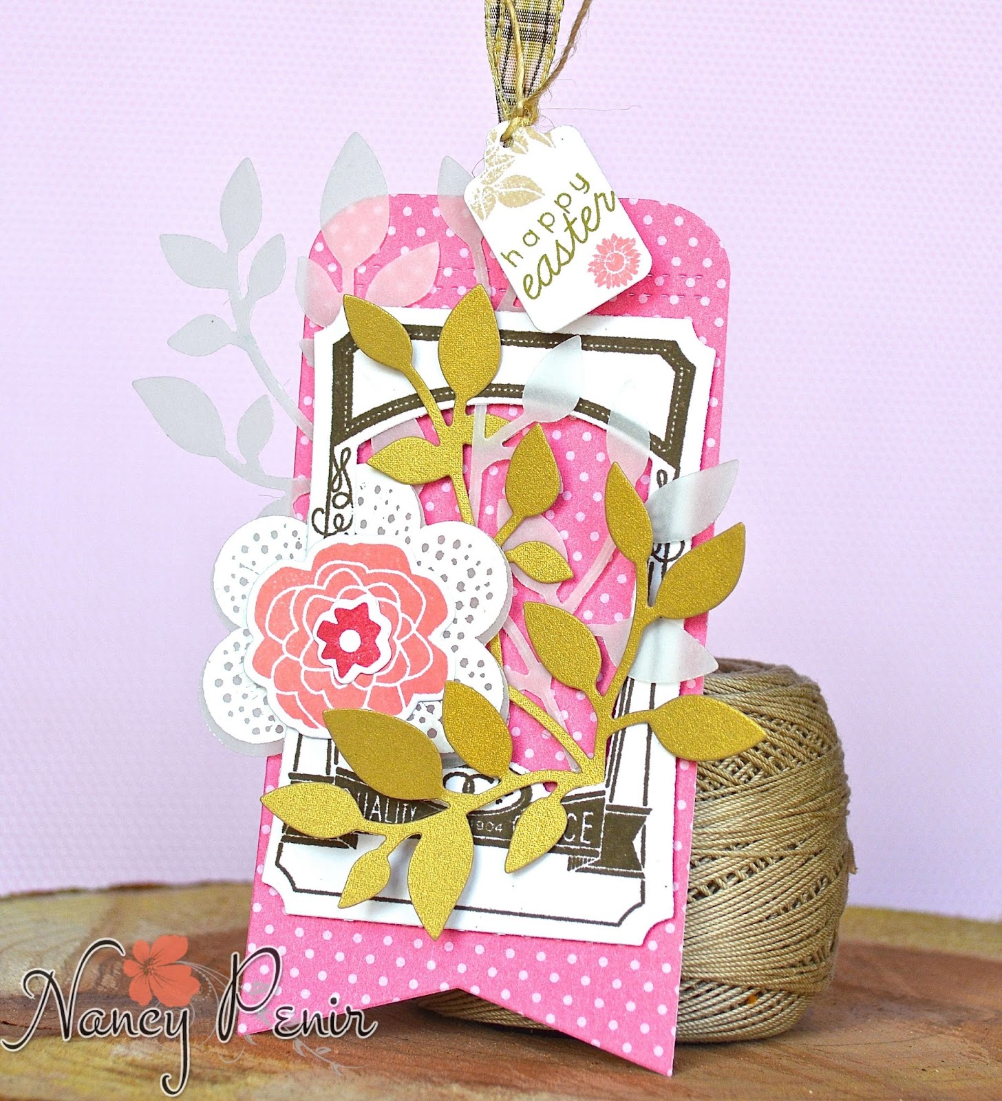 ReplyDeleteThe gold leaves are gorgeous on this beautiful tag! You have so many wonderful layers, loving the added vellum and pink polka dot tag!