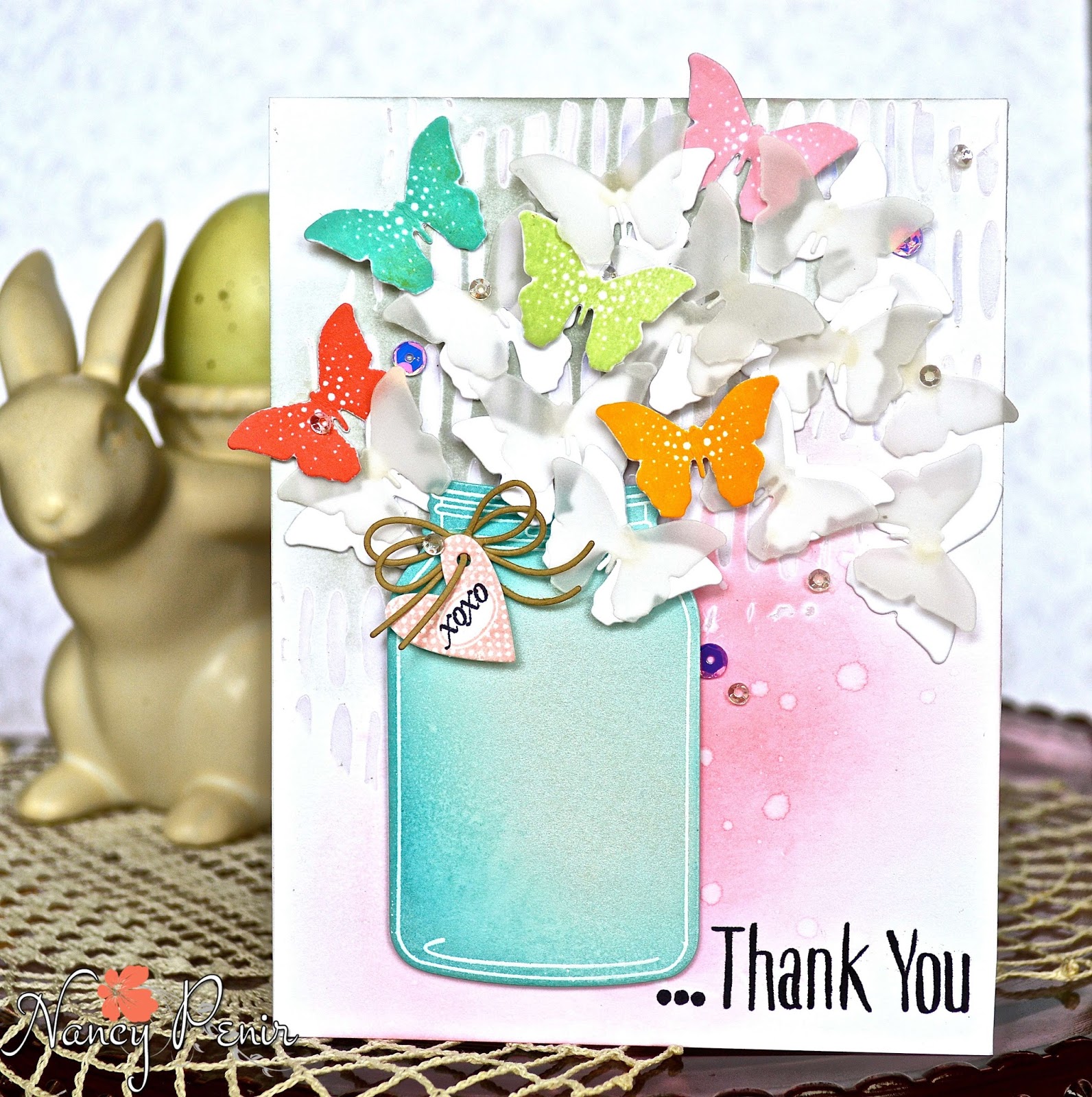 The large butterfly is die cut with vellum, and edged in silver embossing powder.