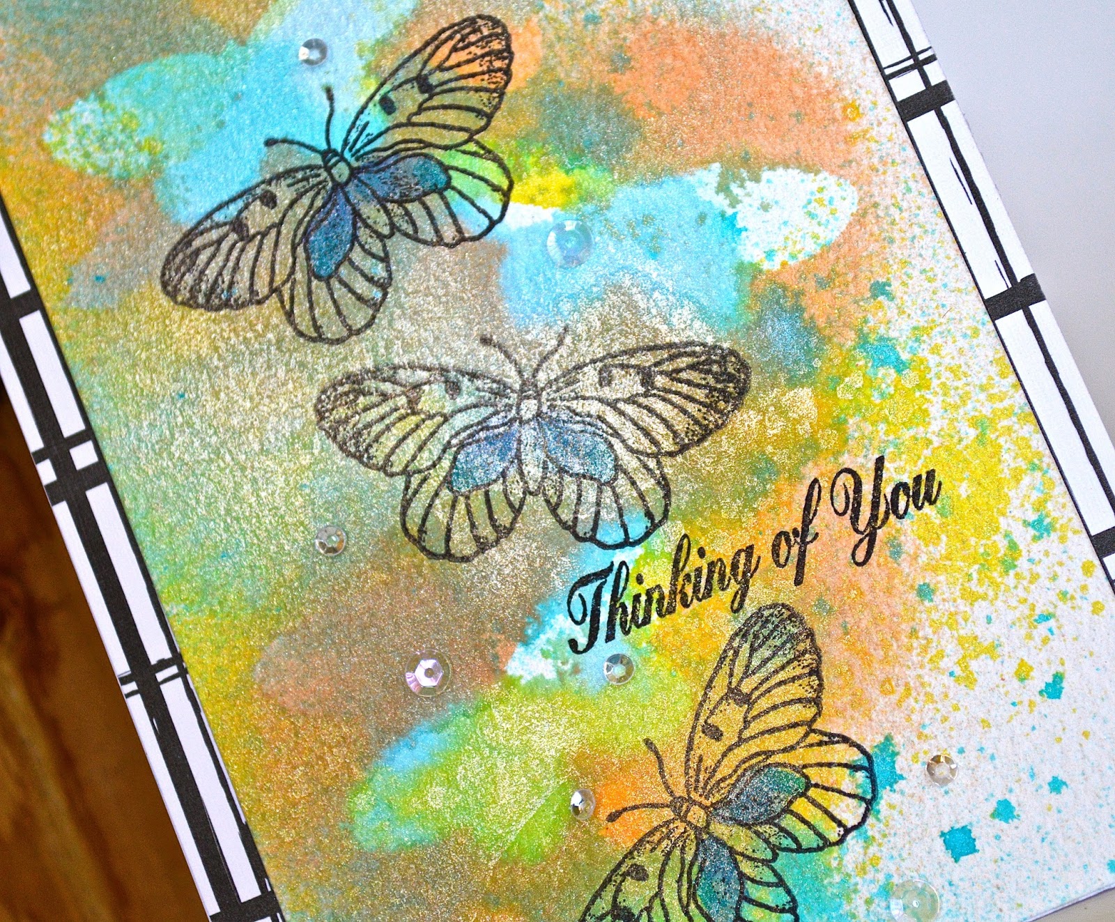 Smooshing with inks, flicking a few drops, and sequins & beads complete the card.
